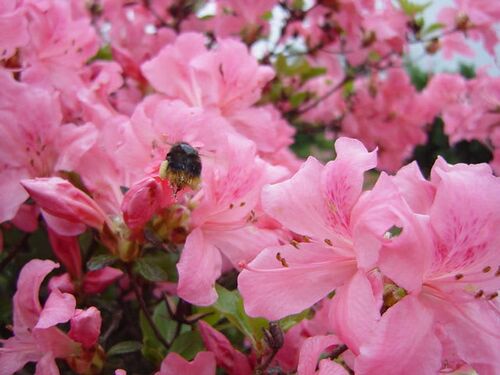 今日、山で鳥見をしていた時の事です。 しばらくここで鳥待ちをしましょう~、という広場で、ブンブンとハチの飛ぶ音。 気になって振り返った先には、まだ満開を保っているツツジについてせっせとお仕事をしているマルハナバチがいました。 甘い蜜はお腹の中…