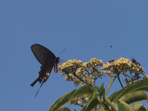 カラスザンショウの花が咲き始めました。 虫たちにとってはうれしいご馳走です。 撮影は昨日の夕方、場所は元町林道北線です。 一番目立っていたのはジャコウアゲハ。 4~5匹のオスが時々争いながら蜜を求めていました。 ジャコウアゲハの手前になにかいま…
