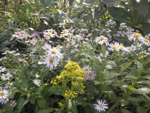 昨日は電気自動車試乗つきのモニターツアー、今日は“るるぶ”取材で三原山を歩きました。 山はノコンギクの花が満開で所々お花畑状態です。 黄色いアキノキリンソウも咲き始め、こういう景色を見ると「秋だな~。」と思います。 風にそよぐススキに光があった…