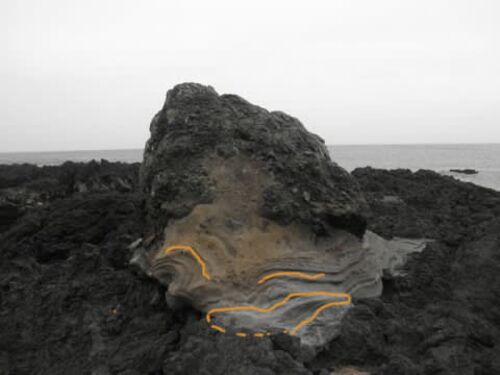 西暦838年の神津島噴火の白い火山灰は大島全土に降り積もり、1cmほどの厚さで残っていて、他の噴火の年代を読み解くための大切な手掛かりとなっています。 その白い層を見るのに一番適した場所の一つが、外輪山の上に建つ温泉ホテルの駐車場です。 ところが…