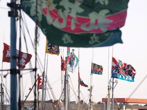 早朝の船祝いには行きませんでしたけど、岡田港(おかたこう)に大漁旗を見に行ってきました。 この光景が好きで毎年見に行ってます。 沖には白波が立って風が強いことがわかると思います。 『風早丸』かざはや丸! いい名前だー。 あんこ灯台をバックに。 …
