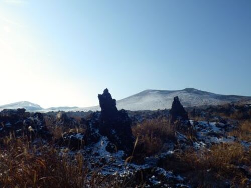 昨日、ツアーで三原山に行ったら…雪がつもっていたので驚きました。 山の上の“温泉ホテル”に宿泊されていたお客様に聞いたところ「昨晩まで何もなかったが、朝起きたら突然雪景色になっていた」のだそうです。 お客様は以前、ご自分達で火口を歩いているとの…