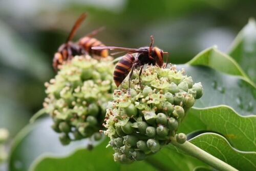 スズメバチで!! ほとんどはコガタスズメバチですが、 たまーにヒメスズメバチも。 スズメバチたち、いつ見てもカッコイイです。 見ているとあちこちでちょっとしたいさかいが始まります。 後ろはキオビツチバチ。見て見ぬふりです。 2匹はこのまま地面に…