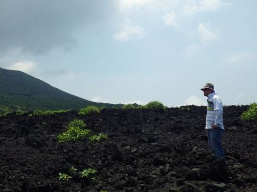 今日は、JRや地下鉄の中で流す伊豆大島のPR動画のロケ下見の方達と、三原山や裏砂漠、海を回りました。 様々な角度から景色を眺め、考えるディレクター氏。 火山灰の斜面を登っているのも、決して滑り降りるためではなく・・・ 位置を変えて、景色を眺め…