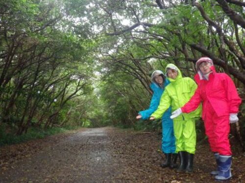 昨日、名古屋からいらしたお母さんと娘さん3名の3時間ツアーに行ってきました。 「1日雨」の天気予報に、前日から「雨でも楽しめる場所を」とリクエストを受けていました。 レィンウェアと長靴をお貸しして、13時30分頃に小雨の中をツアー開始。 皆さん「雨…