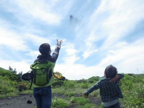 昨日、今日の2日間、気持ちの良い青空の下を歩きました。 昨日のお客様は、5歳の息子さんとお父さんの男同士の2人旅! “マグマのしぶき”が冷えてできた小石を、空に向かって投げ上げる2人。 (いい雰囲気だなぁ~) ジオガイド講習生(島内のタイヤキ屋さん…