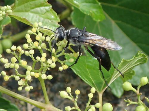 一昨日の朝、ノブドウの花に来ているのを見つけました。 地面に穴を掘ってキリギリス類を狩り幼虫の食べ物にするそうです。 大きくて目立つハチなので過去にキリギリスを運んでいる場面に出会っていてもいいのですが、まだそのような幸運に恵まれていません…