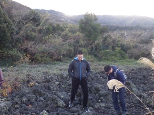 室蘭栄高校、伊豆大島巡検最終日は、約2時間の短時間ツアーでした。 まずは土砂崩れが新たな地面を作っていく風景を見てもらうために、元町溶岩流へ。 この後、砂防ダムを見学し、海岸で海に流れた溶岩の上を歩いて観察してもらう予定でしたが… なぜか突然…
