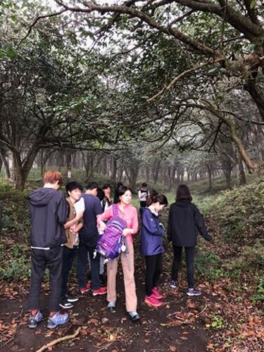 今日は法政大学文学部地理学科の皆さんの巡検を案内しました。 学生さんたちの事前レポートにあるテーマは…「風穴」「台風災害」「船の使用港」「防風林」「植生」「植生遷移」「農業」「椿」「製塩」など、本当に様々。 で、最初の立ち寄り先は、種子を取る…