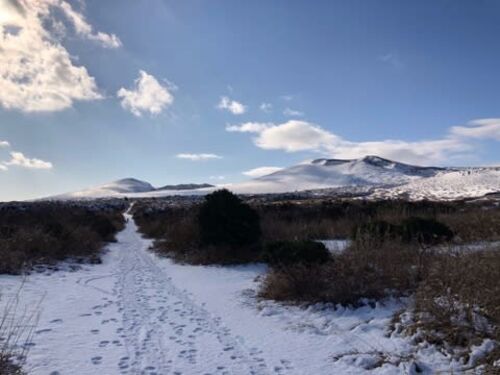 昨日は、島生まれのリピーターのお客様&お友達と裏砂漠に行ってきました。 前日は真っ白だった裏砂漠への道は… かなり雪が溶けて、黒い地面が現れていました! 雪で真っ白になった道を歩くのは私にとっては非日常で楽しいけれど… こういう黒と白のマダラな模…