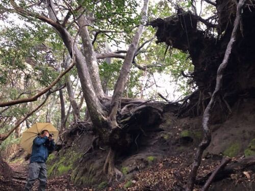 森林インストラクター先輩のKさんとの2日目ツアーは、朝から雨でした! Kさんのリクエストは「地層大切断面」と「巨木の森」と「椿園」 で、地層を見た後、久しぶりに薬師堂の巨木たちに会いに行きました。 相変わらず迫力のあるスダジイの根っこたち。 土…