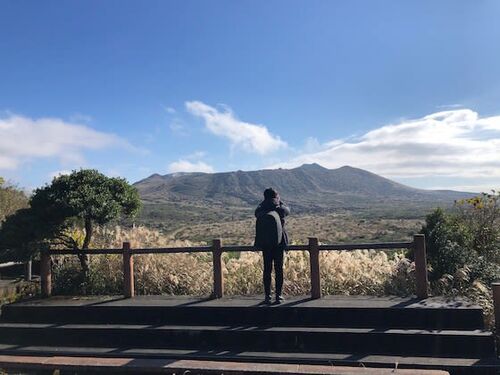 今日は一人旅の男性と、火口〜裏砂漠を歩いてきました。 爽やかな青空の下で歩き始め… 山を登って空を見上げたら、モコモコとしたひつじ雲(?) そこに、ちょっと生きものっぽい(?)灰色の雲がやってきて、ひつじ雲の下を左から右へ移動して行きました。 …