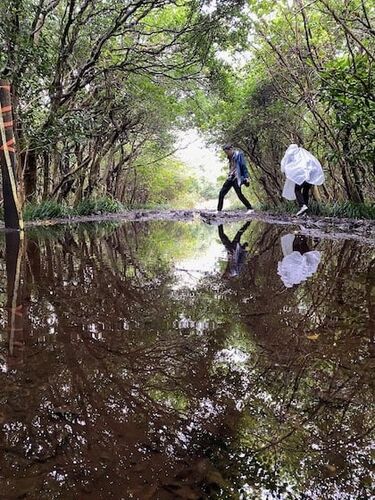 昨日は、都内に住むご夫婦と、裏砂漠ツアーに行ってきました。 「昼ごろまで小雨、午後から曇り」の天気予報と雨雲レーダーを見て、最小限の雨装備(お客様は傘と雨がっぱ)で、出かけたのですが… 森には、予想より大きな水たまりができていました。 雨は時…