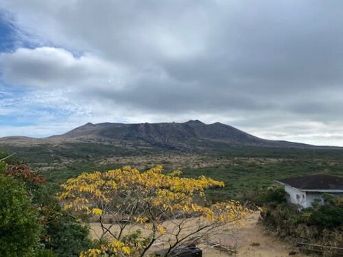 今日は、東京と千葉からお越しの女性2人旅のお客様と、三原山に登ってきました。 スタート時の風景がこちら。 三原山の上に黒い雲の塊があるのが気になりましたが、黄色く色づいた木の葉が美しかったし 溶岩地帯に自生しているヤブツバキには、真っ赤な花が…