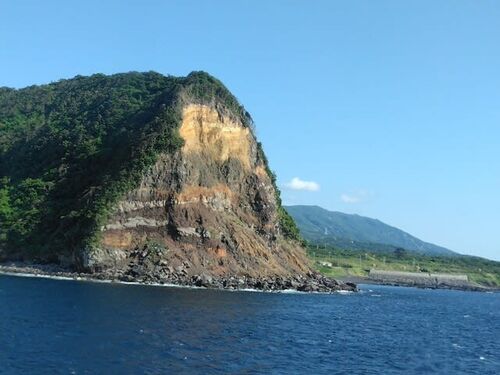 丸いドーナッツを半分に切るとこんな感じの現れませんか? 崖が崩れてフレッシュな中身を見る事が出来ます 大島の北部 岡田港近くの乳ヶ崎です。昔々大島ができる前に有った岡田火山の一部です。その後大島火山が爆発して岡田火山と着き(付き) そしてまた波…