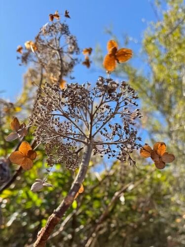熱は下がったものの、咳、痰、息苦しさは相変わらずで、本日のツアーも別のガイドにお願いし、デスクワーク中心の1日。 数日ぶりに庭に出たら、ドライフラワーと化したラセイタタマアジサイに光が当たって、輝いていました! 青空と一緒に。 綺麗だなぁ〜と…