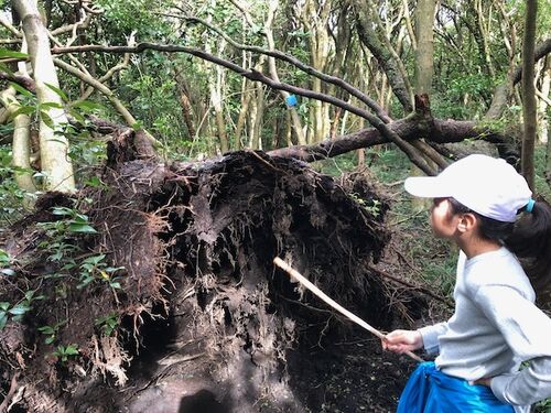 2019年の強風の台風のあと、裏砂漠では地表面に積もっていた小石(スコリア)が風で飛ばされ、木々の皮が半分剥がれ落ち、森の中でも多くの木が倒れました。 そのとき、めくれ上がった木の根のすき間には、まだ地上に出てくる前のセミの幼虫がいて、思わず息…