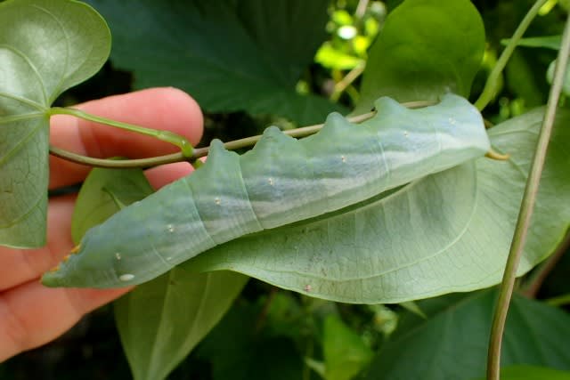 2018-08-01 キイロスズメ幼虫 虫 います。 よーく見てください。 ほらほらー。 葉っぱをどけると・・・ じゃーん! 素晴らしく立派な終齢幼虫です。 ちょっとモデルを頼みました。 ご、ごめんよう・・・緊張してピーンとなってます。 それにしてもこの透明感とムチムチ感。 ぎゅっとヤマノイモをつかんでる腹脚と尾脚がなんともかわいらしいです。 この子は綺麗な緑色ですが茶色い子もいます。 褐色型はコチラ。 最後は私の大好きなお祈りのポーズ。 どうか無事に成虫になって欲しいです。 がんま