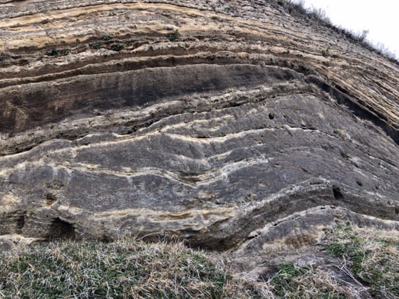 かなりスケールの大きな、模様があっていない場所(不整合)もあります。