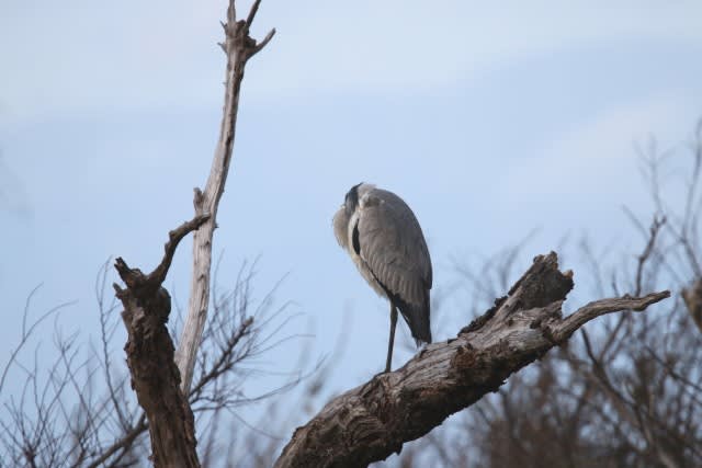 2020-01-15 アオサギ 鳥 時間があればいつも見に行っている牧場で。 遠くの枯れ木になにやら違和感。 あ。 やっぱり鳥がいました。 アオサギ。 寝てんのか? 近くに行ってみよう! ・・・寝てる・・・ 気配を感じて顔を出しますが、 またすぐに顔を羽毛にうずめてしまいました。 なんだかものすごく疲れているように見えました。 昨日の撮影です。 がんま