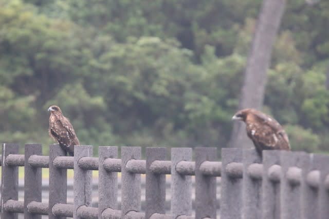 2020-09-05 トビ 鳥 海岸沿いの擬木柵にトビが2羽とまっていました。 どうやら今年生まれの幼鳥のようです。 きっと兄弟でしょう。 手前の子は鳴いていました。 しかもかなり激しく。 お腹が空いて親鳥を呼んでいるのでしょうか。 表情があどけないです。 いくら鳴いても親鳥は姿を見せませんでした。 この子たちのために食べ物を探しに出掛けているのだと思います。 9月3日撮影。 がんま
