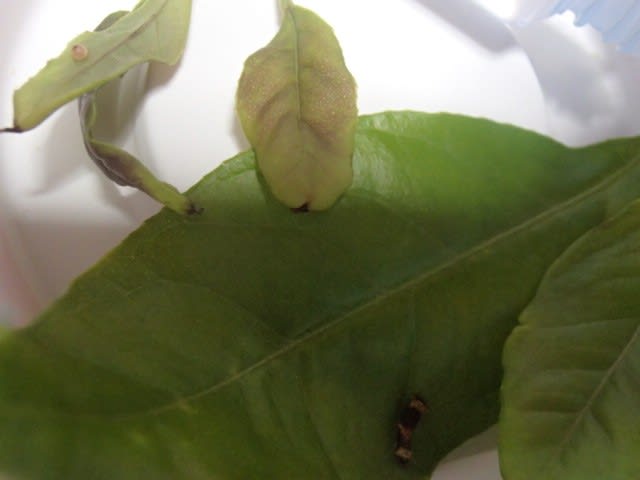 それに卵は2個しかありません。でも、1匹孵っていました。レモンの木から偽レモンの葉に移動してもらいます。