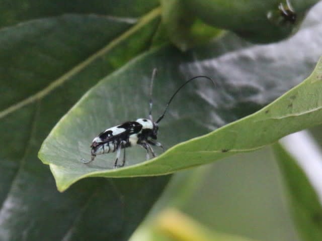 2021-07-17 とうとう入ってきた 虫 これですこれ。 この虫さん。 ラミーカミキリです。 撮影は今月5日、島の北部で見つけました。 なかなか人の気配に敏感で近付くとすぐに飛んでしまいこんな写真しか撮れませんでした。 外来種で本土の関東から西ではもう普通に見ることができるようなので見たことがある人はたくさんいるでしょう。 私にとっては憧れの虫のひとつです。 ・・・模様がタキシードを着たガチャピンに似ているということで。 この画像ではわかりませんがネット上にはまさに!というものがたくさんあるので気になる人は探してみて下さい。 がんま